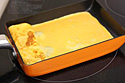 - 弱めの中火で卵焼き器をあたためる。卵液を流し込む前に、濡れふきんにあたためた卵焼き器を押し付けて一度温度を落としてから焼くと、こげを防ぎきれいな焼き上がりになります。油適量をひき、卵液の1/3の量を流しこむ。