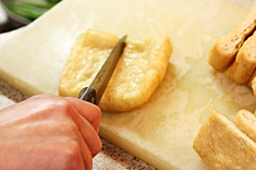 おとうふがそのままお揚げになったような、ジューシーな京揚げ。煮ても焼いてもおいしいので、日々のお料理に幅広くお使いいただけます。