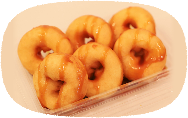 豆乳ドーナツにキャラメルや黒みつきなこをかけた食べ応えのあるスイーツです。 (小麦、卵、乳を使用しています。) 錦市場に来るたびにお楽しみいただける、その時にしか⾷べられないドーナツをお楽しみください。